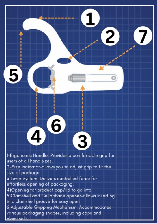 I conducted interviews with individuals experiencing mobility issues and began designing the shape of the tool. The design incorporated features for stability, ease of alignment, and the ability to open clamshell packaging and cut through cellophane. I collaborated with inventor Bruce Ferris, who provided insights into functionality and materials. After realizing that the tool’s shape and engineering required adjustments, I returned to the drawing board to address these challenges.